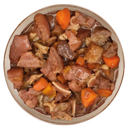 Nourriture humide complète pour chien. Ragoût aux oreilles de porc 100% naturel et équilibré. Cuisine maison authentique. Votre chien va adorer.