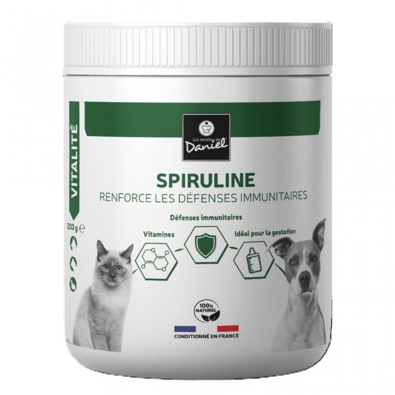 La spiruline "Les recettes de Daniel" aide à renforcer les défenses immunitaires des chiens et des chats.