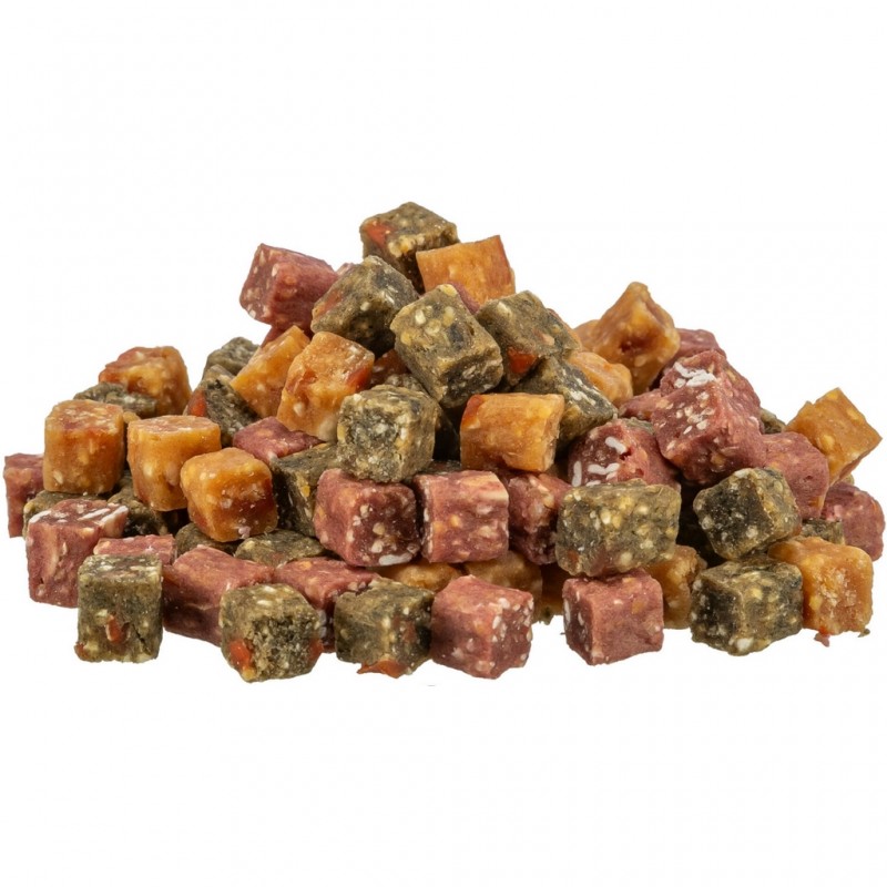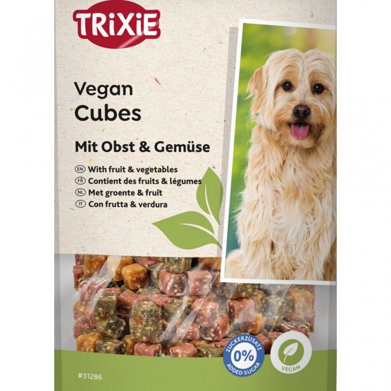 Cubes Vegan composés de fruits et de légumes de la marque Trixie. Convient à tous les chiens, même lors d'un régime alimentaire, avec seulement 1 % de matière grasse. Sans céréales, sans sucre ajouté.